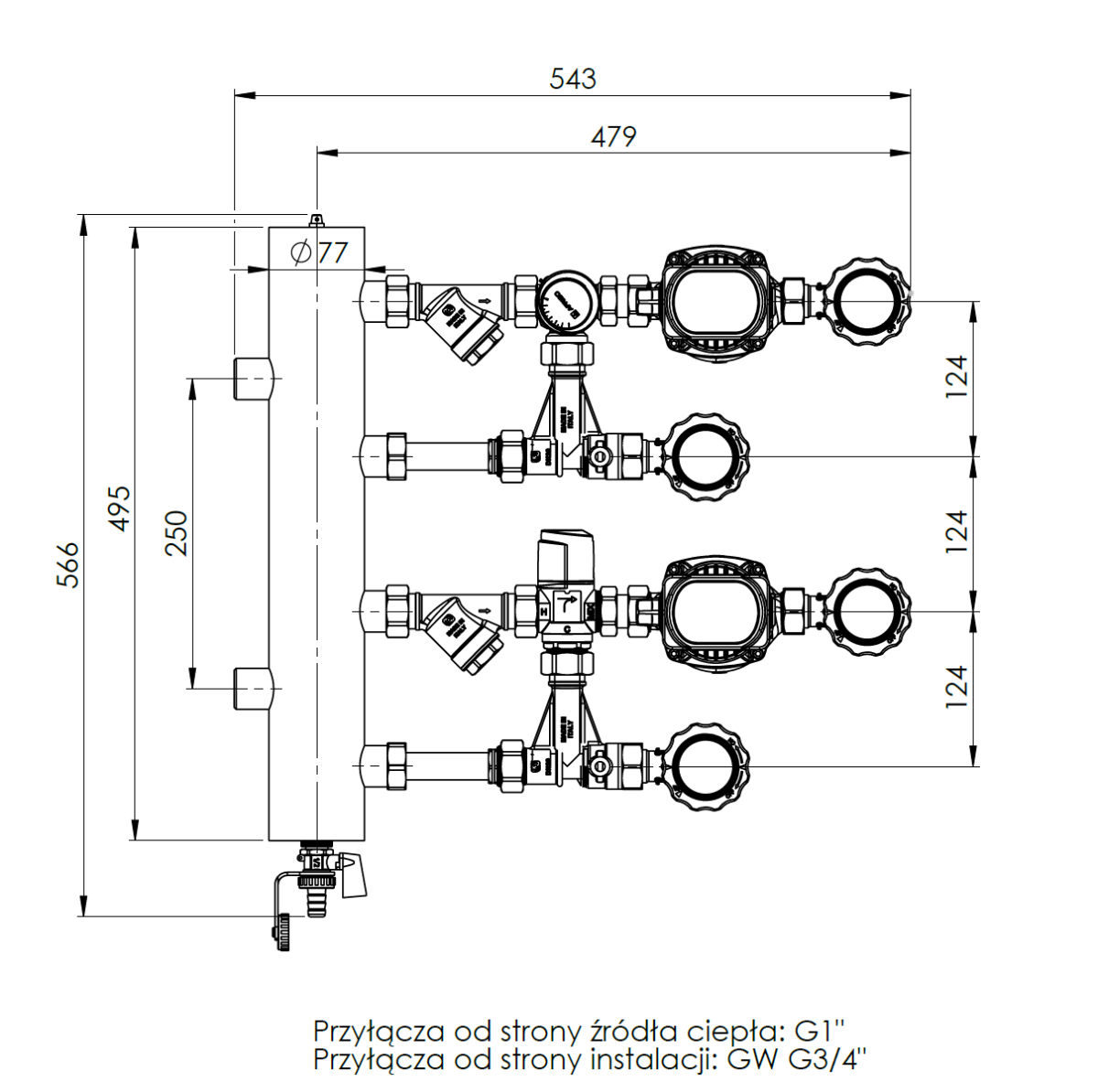 Гидравлическая стрелка с ручным воздухоотводчиком и сливным краном для удаления загрязнений, выпавших в осадок в теплоносителе.