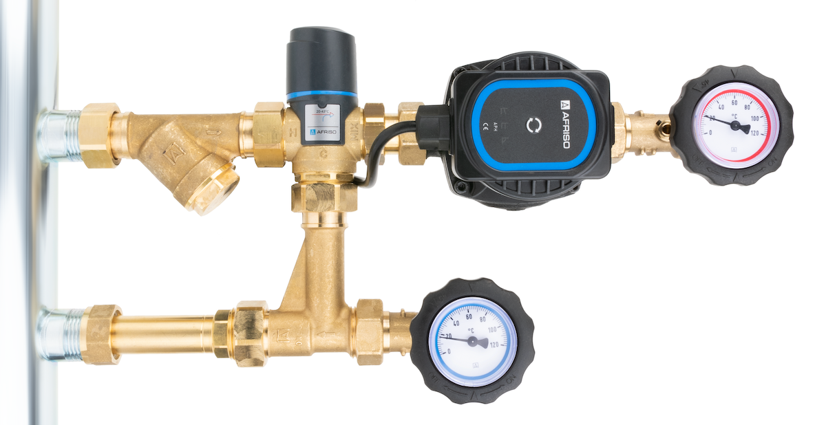Термостатический смесительный клапан ATM 561 (Kvs 2,5 м³/ч) с диапазоном регулирования температуры подачи 20-43°C.