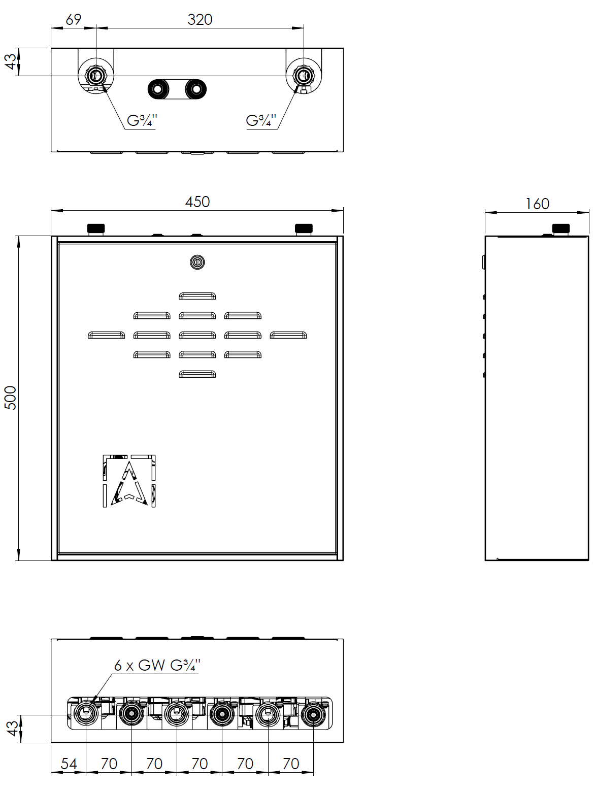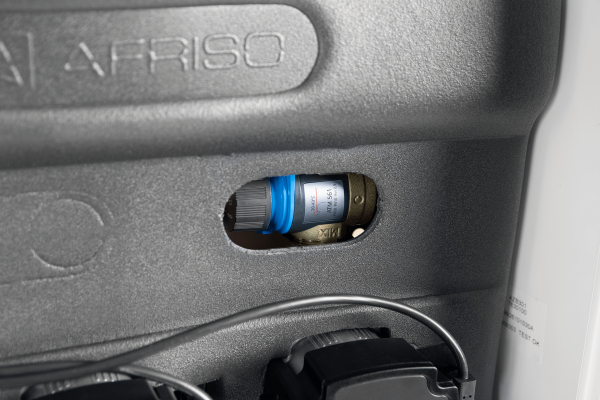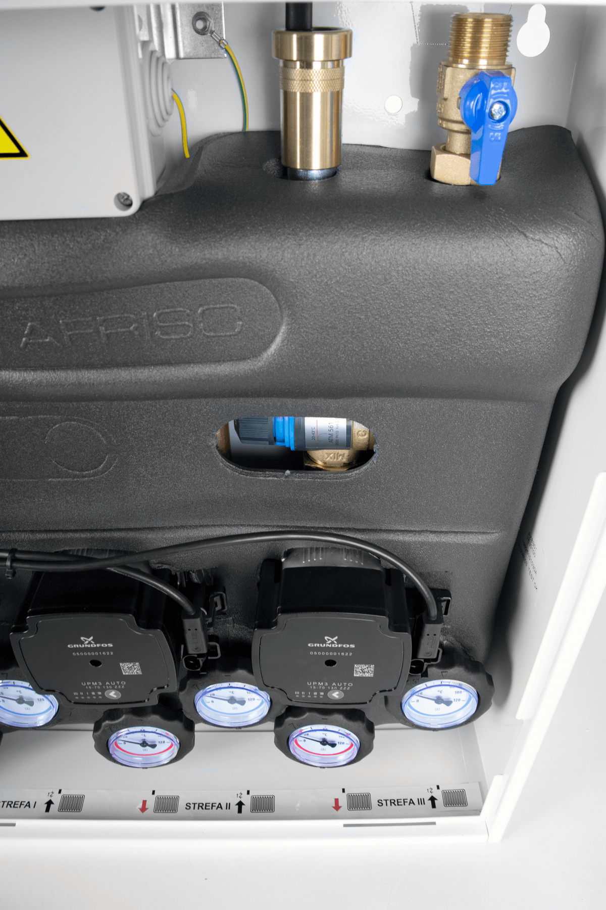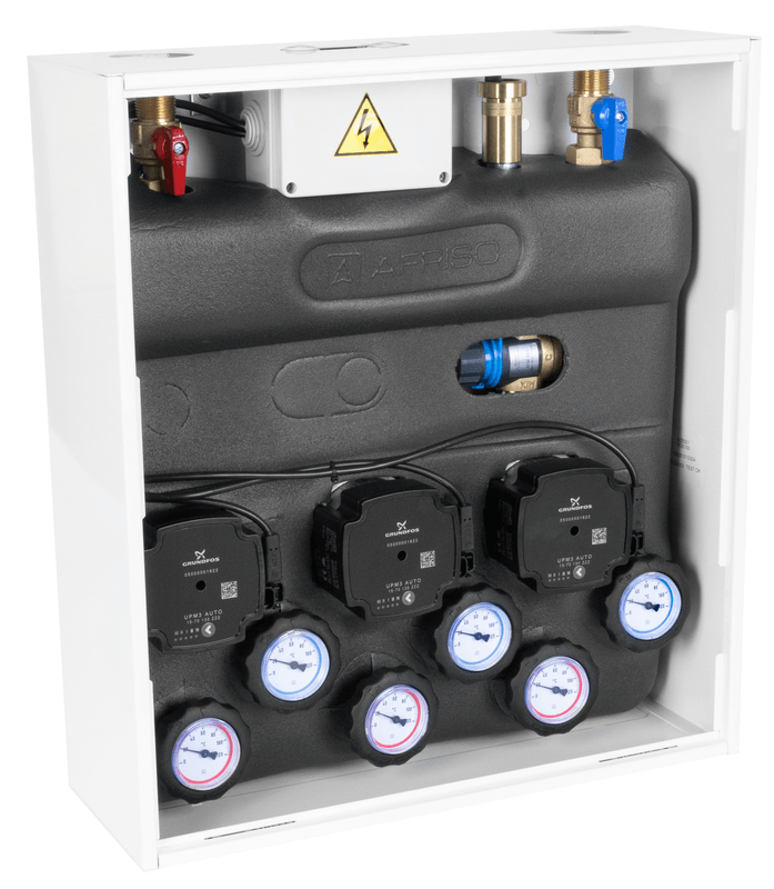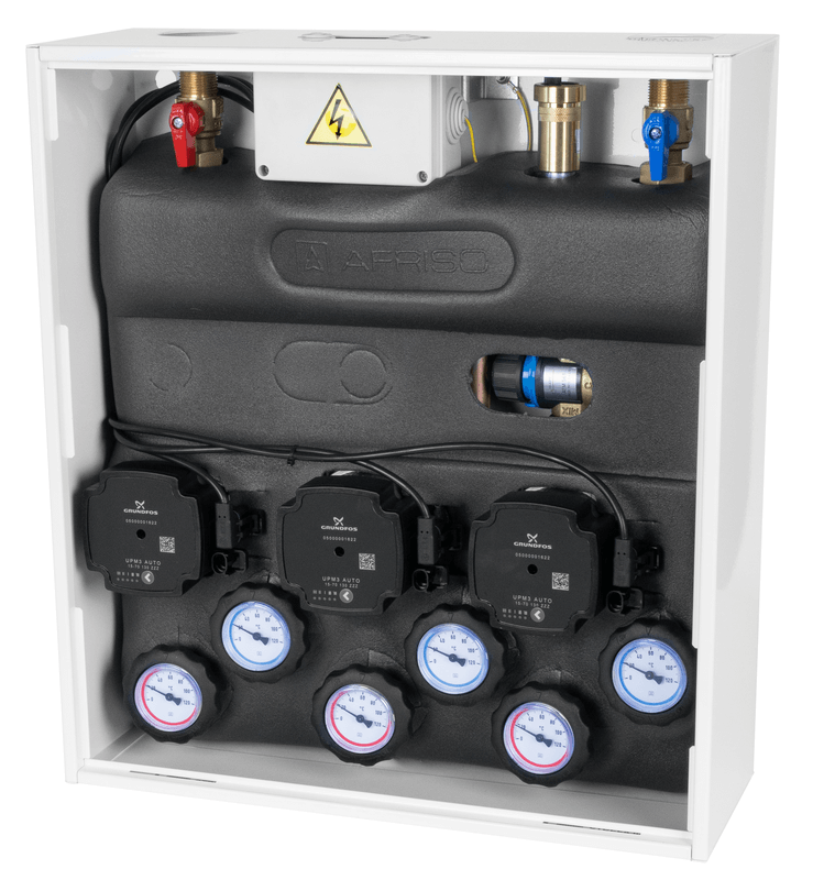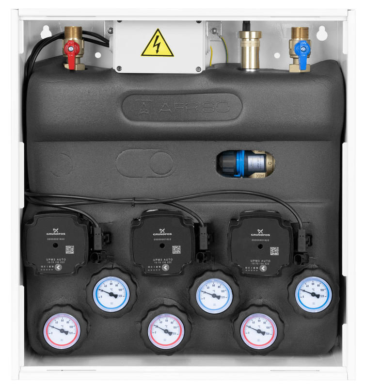 Оснащен насосами Grundfos UPm³ и термостатическим смесительным клапаном ATM 561 с регулировкой 20 ÷ 43°C. Диапазон подобран на основе оптимальных температур подачи для систем напольного отопления.