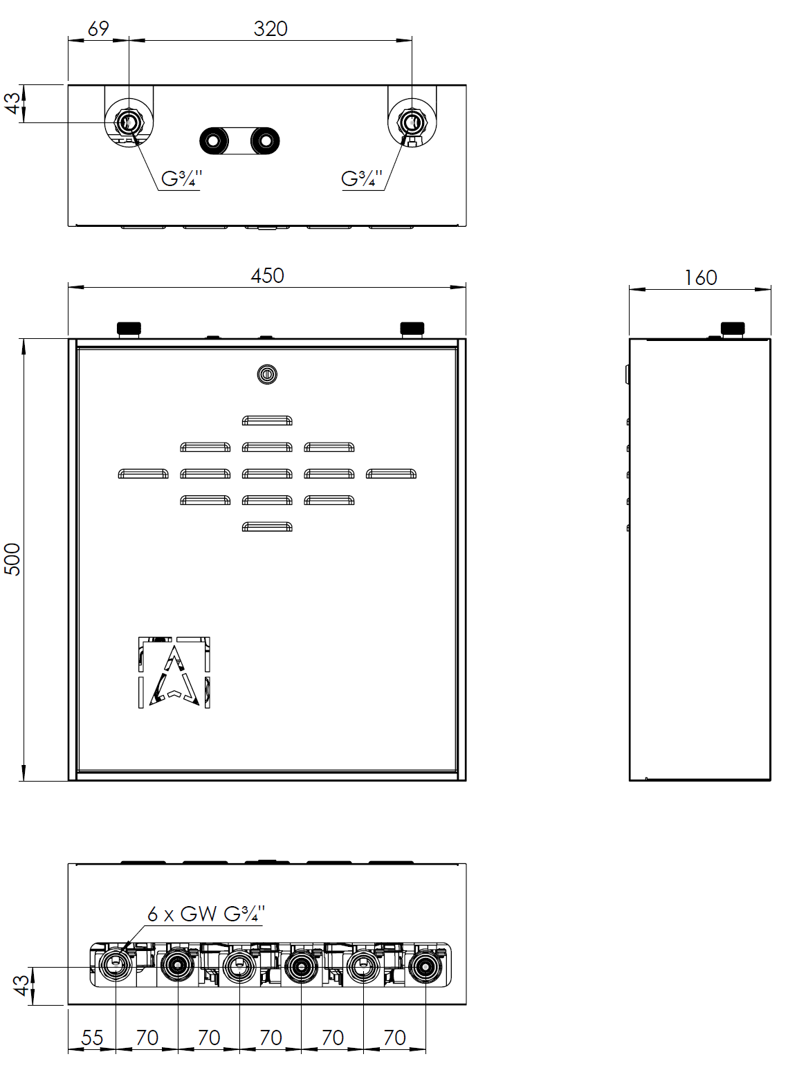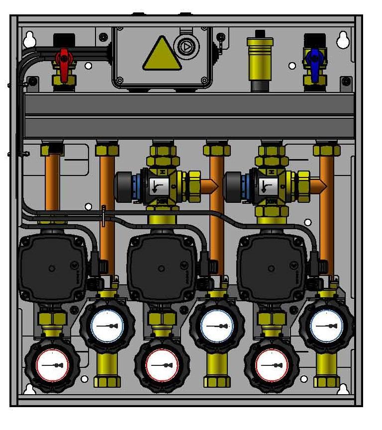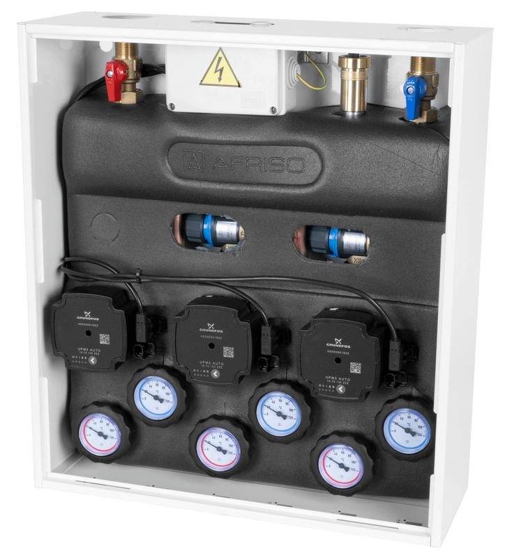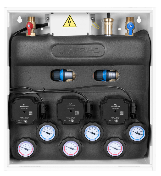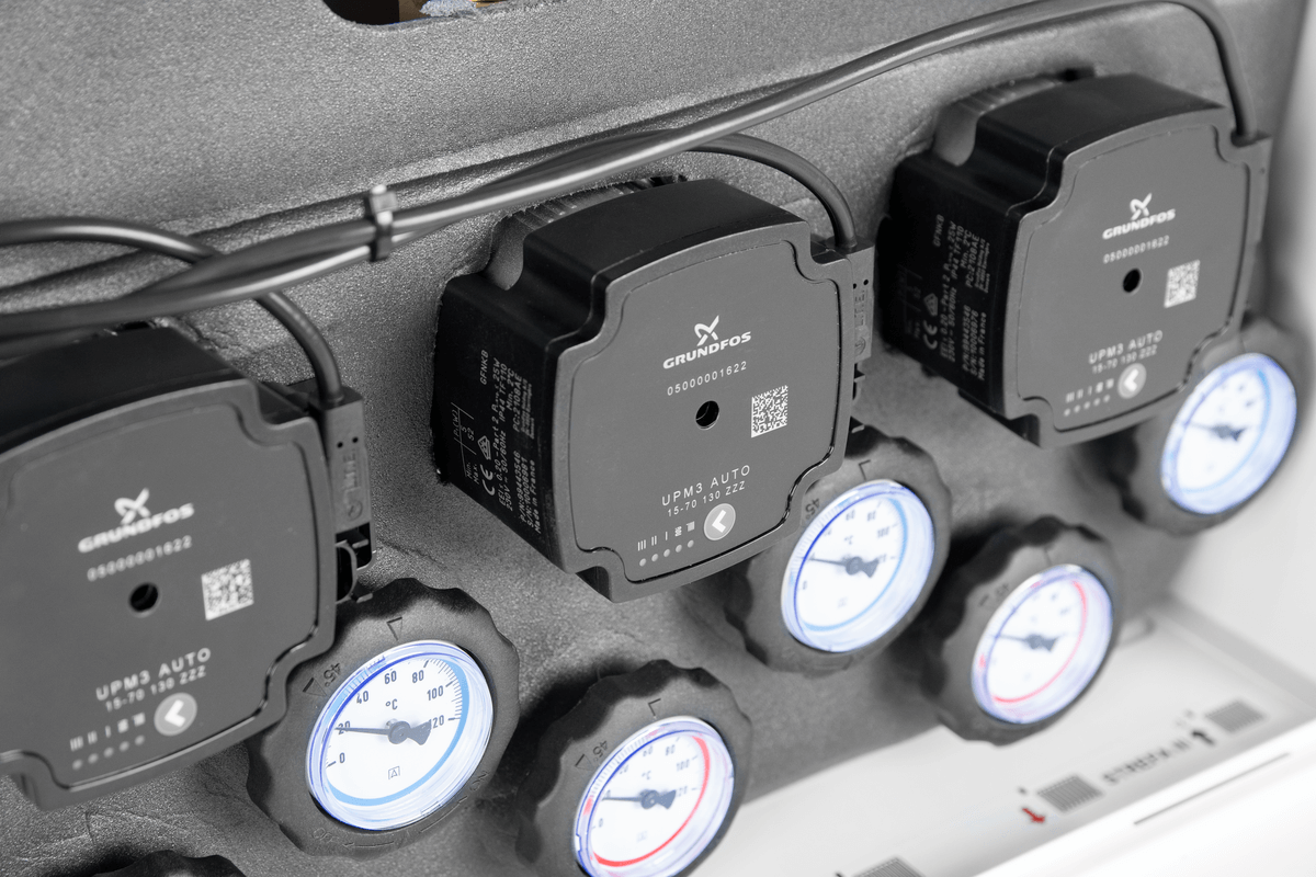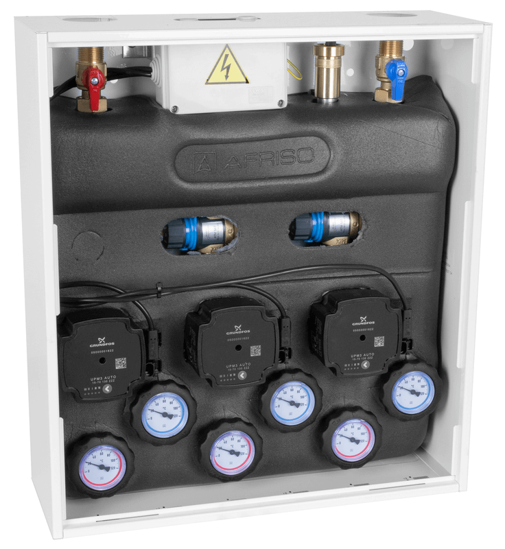 Оснащен насосами Grundfos UPm³ и термостатическими смесительными клапанами ATM 561 с регулировкой 20 ÷ 43°C. Диапазон подобран на основе оптимальных температур потока для систем напольного отопления.