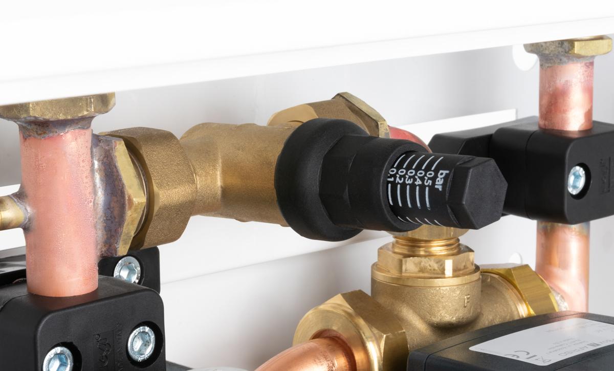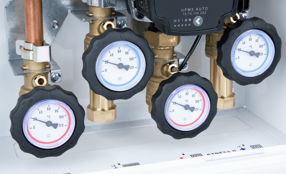 Оснащен насосом Grundfos UPm³, перепускным клапаном DU, смесительным клапаном, запорными клапанами со встроенными термометрами.