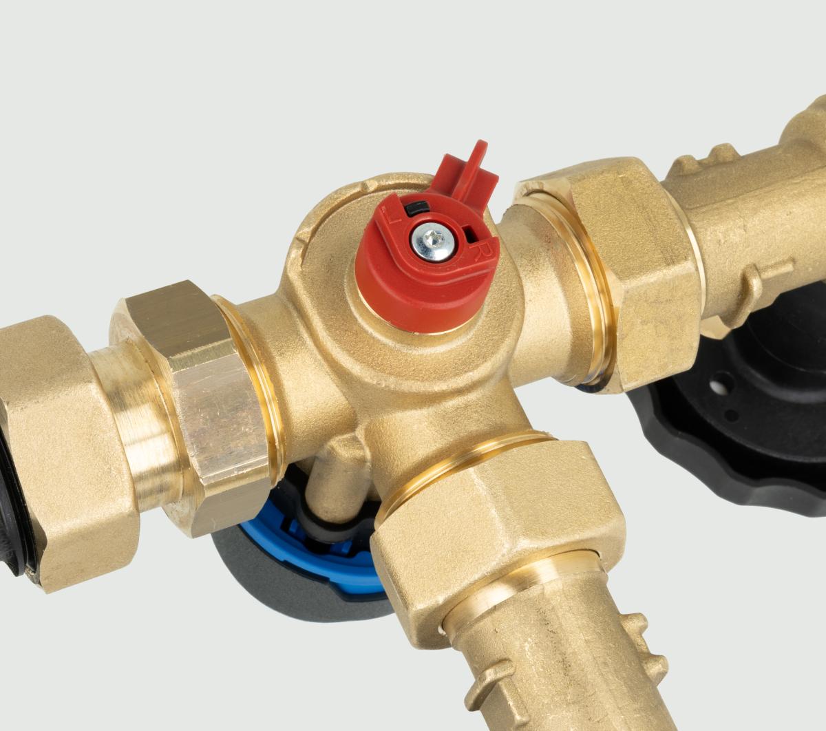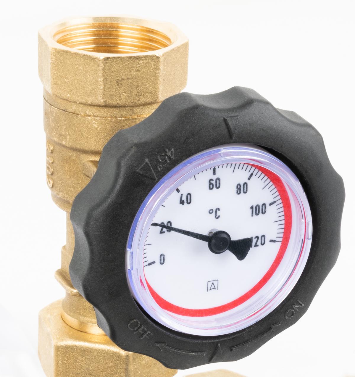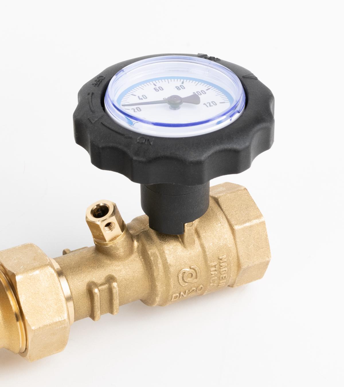Запорные клапаны со встроенными термометрами для контроля температуры теплоносителя на каждом соединении.