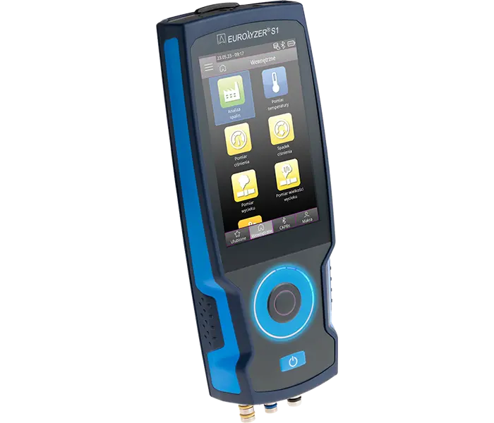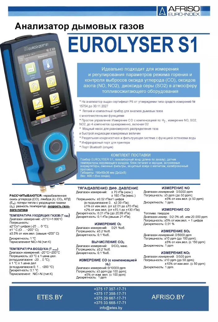 Газоанализатор «EUROLYZER S1» с измерением тяги или дифференциального давления, О2, CO, NO, (SO2, NO2, CO+ на выбор), Твозд., Тгаза, расчет СО2, qA, лямбда, NOx, защитный чехол с магнитами, датчик температуры окружающего воздуха, модульный газозаборный зонд (длина от 300 мм до 2000 мм на выбор), базовая рукоятка со шлангом и сборником конденсата, запасные фильтры, блок питания, соединительный кабель для блока питания, ИК-принтер — опция, пластиковый кейс или транспортировочный чехол для хранения прибора и принадлежностей, Bluetooth, память.